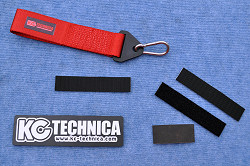 KCトーループ(耐水KCロゴ入り)、取付専用スナップフック、補助用マジックテープ、予備テープ、保護クッション付き