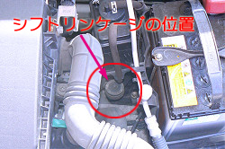 エンジンとバッテリー間の隙間の奥にワイヤー式のシフトリンケージがあります